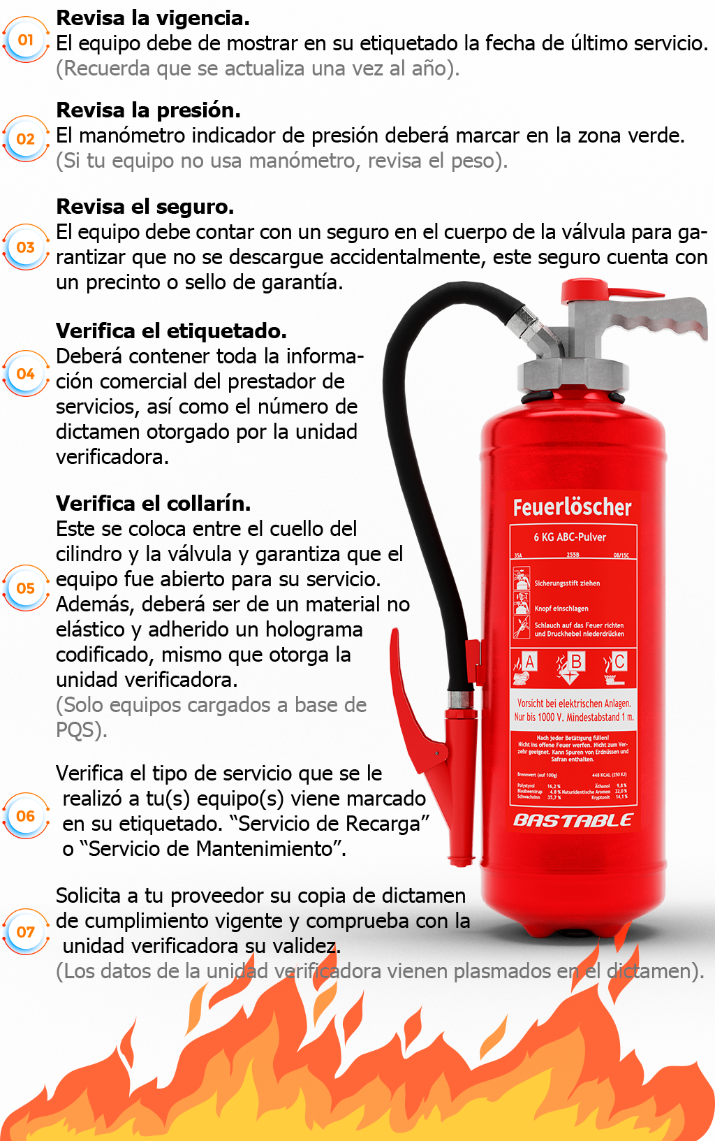 Hoy en día, todo prestador de servicio en el mantenimiento y recarga de extintores, debería estar acreditado y dictaminado ante la NOM-154-SCFI-2005, puesto que entró en vigor el 18 de junio de 2007, una vez que se dio aviso, a través del DOF, de la existencia de la infraestructura para la evaluación de la conformidad de la misma. De lo anterior surge un cuestionamiento, ¿qué evalúan y acreditan las unidades de verificación? Inicialmente, que el prestador esté debidamente establecido y registrado como todo centro de trabajo; revisan también, una parte documental donde se acredita, entre otros, lo siguiente: Contrato de adhesión ante PROFECO, certificados y cartas garantías de los insumos y refacciones que se compran, etiquetado con información y medidas normativas, las constancias de habilidades laborales de los técnicos del taller. Por otra parte, se debe contar con todo el equipamiento y herramientas indispensables para el servicio, como, por ejemplo: recipiente para descarga de extintores, báscula de plataforma verificada, sistema de llenado de extintores, equipo para detección de fugas. Pero esto no es todo, ya que hace falta mencionar que se realizan las pruebas de funcionamiento necesarias para comprobar que se trabaja de acuerdo a los procedimientos de mantenimiento y recarga, además, se muestrean equipos para verificar su funcionamiento, tiempo de descarga, alcance o distancia de descarga y porcentaje de descarga. Como el lector puede inferir, es de suma importancia tener un extintor o extintores en nuestro negocio, empresa u hogar, pero también es de suma importancia que estén cargados por empresas acreditadas para garantizar su buen funcionamiento en caso de ser necesario utilizarlos. Por eso, aquí te compartimos siete consejos básicos para revisar si el equipo está o no óptimo, y que ayudan a identificar si el proveedor cumple con las normas oficiales.